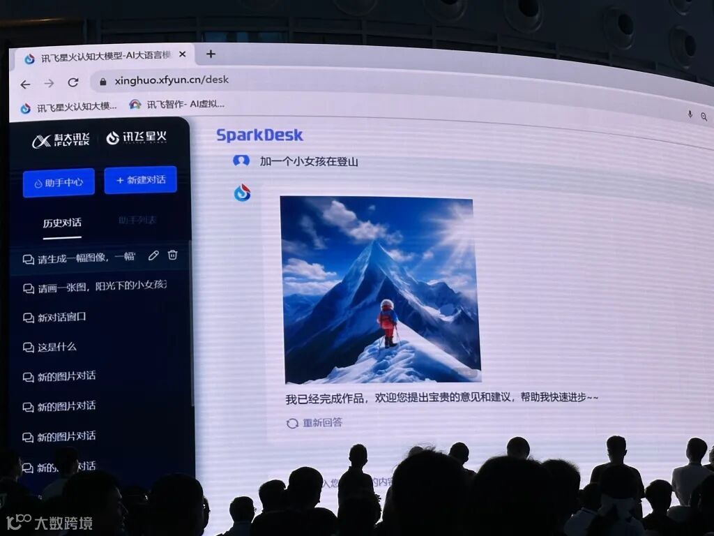 刘庆峰谈道,在国内业界公开可测的大模型中,星火对图像的理解能力明显领先。用户还可以追加在雪山图片中加入“一个小女孩在登山”的元素。