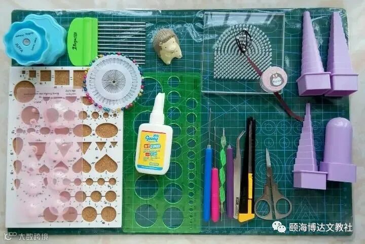 纸板,市面上有出售的衍纸板,多是用软木制作,其中一面有一个塑料板,上面有各种型号的孔洞,方便你制作出不同规格的卷纸。当你涂好胶水的卷纸在凝固的时候,你需要在板子上插上针,帮助卷纸固定。