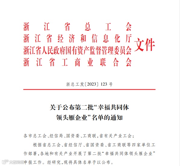 近日,省总工会、省经信厅、省国资委、省工商业联合会联合下发《关于公布第二批“幸福共同体领头雁”名单的通知》,经层层推荐、审核,永康有两家企业上榜。