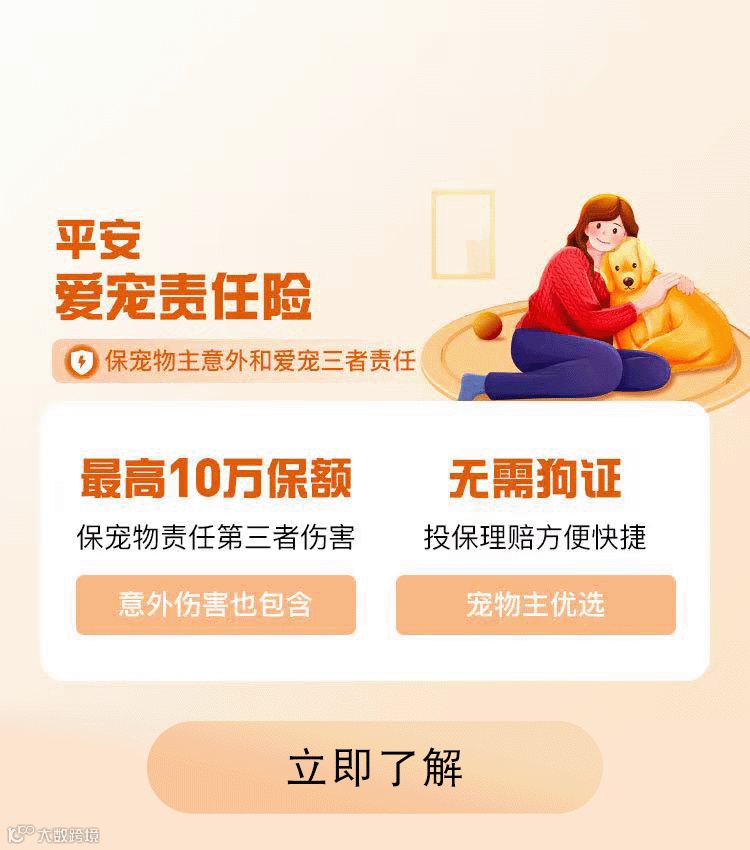 爱宠责任险不仅能保障宠物主(被保人)身故残疾和意外医疗,还能保障毛孩子无意间伤到其他人,最高达到10万保额。