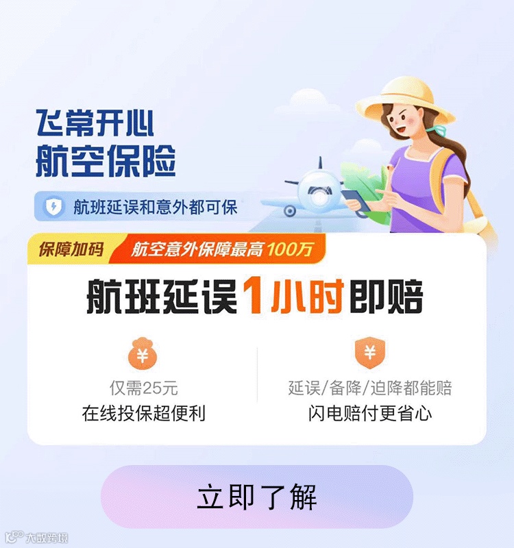 航班起飞延误已经成了一件见怪不怪的小事,但却十分影响出游心情。所以一款既能赔偿航班延误(机场罢工、机械故障、自然灾害),又能保飞机意外伤害残疾、身故的航空保险就很有必要了。