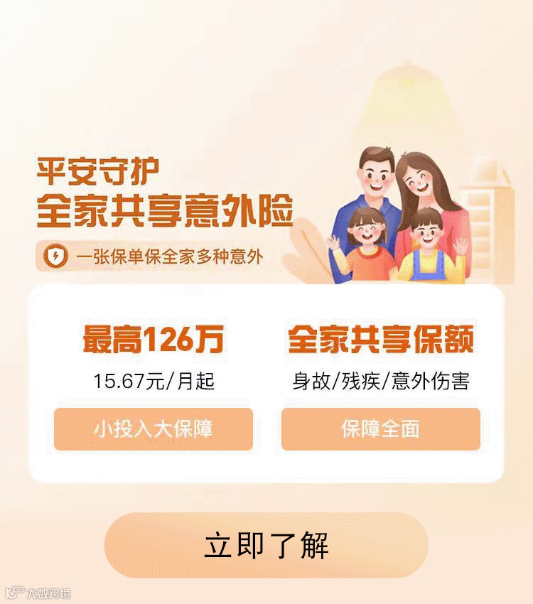 一张保单能保全家(保障本人、配偶、子女、最多4人),全家共享最高126万保额。意外风险保障全面,包括但并不限于摔伤、烫伤、触电、爆炸等等,意外伤害医疗最高5万元保额,住院护理津贴最高保额1.35万元。