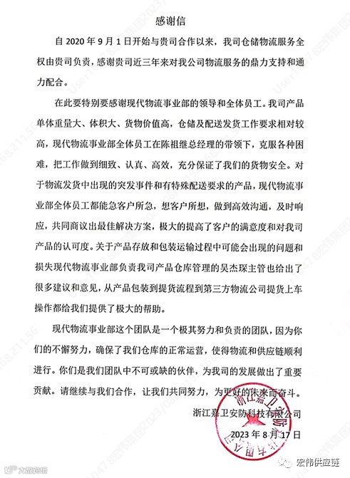 近日,宏伟云仓收到了一封来自浙江嘉卫安防科技有限公司(下称:嘉卫安防)的感谢信。信中提到自2020年9月开始,宏伟云仓为嘉卫安防提供了仓储物流服务,感谢宏伟云仓三年来的鼎力支持和通力配合。