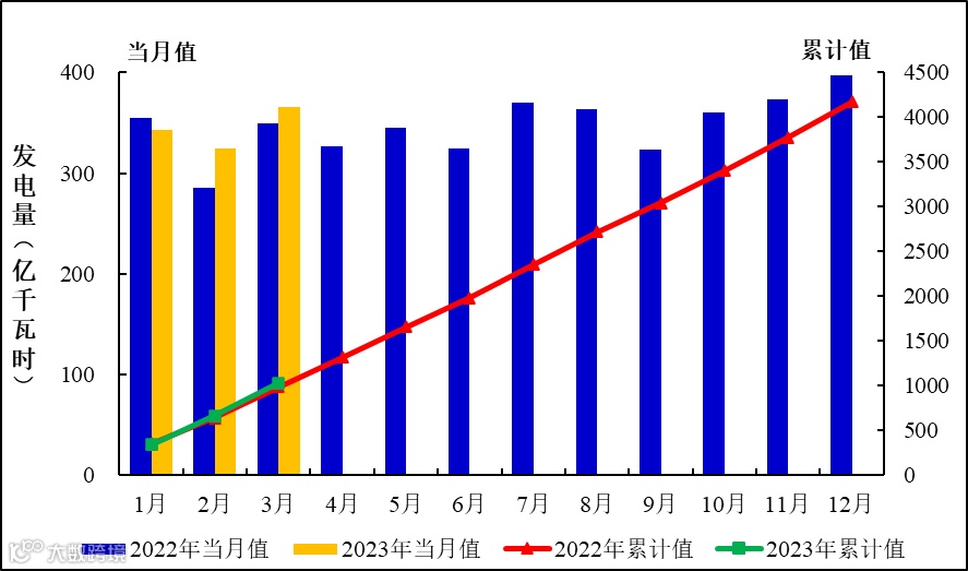 图2:2022年1月至2023年3月全国运行核电机组发电量趋势