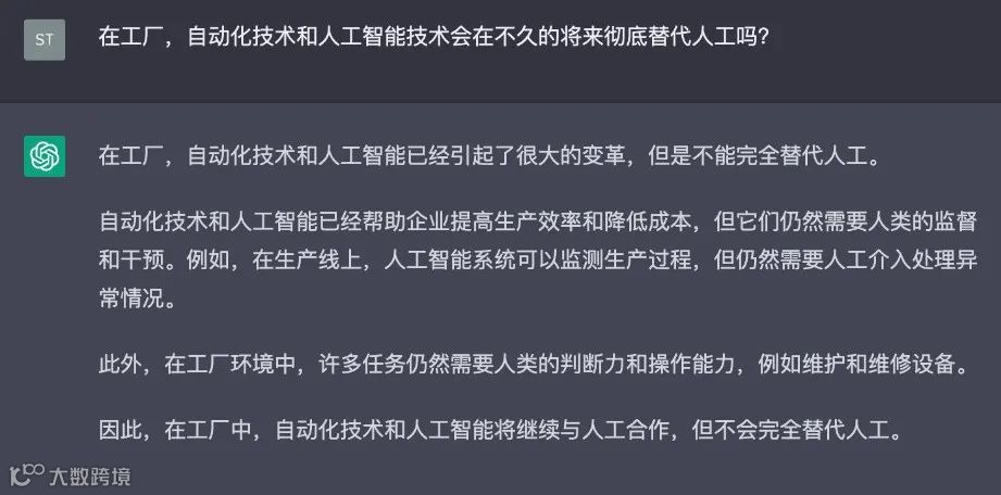 此外,针对最近大家热议的ChatGPT是否会抢了某些行业打人工的饭碗,对于这一问题,也有网友询问了ChatGPT,未来自动化技术和人工智能技术会彻底替代人工吗?ChatGPT也给出答案:不会。