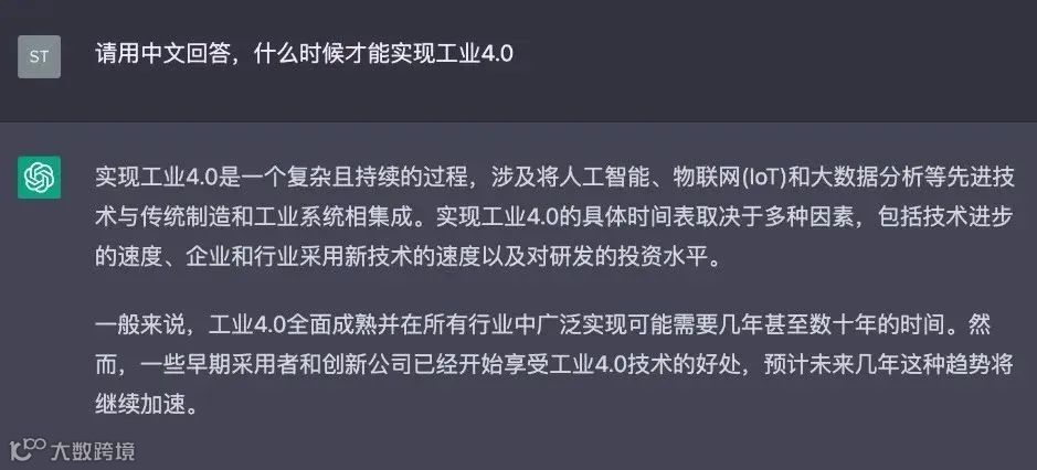 工业互联网是助力制造业高质量发展的重要抓手,也是应对工业发展挑战、推动转型升级的重要战略的关键引擎。我们什么时候能够实现工业互联网、工业4.0?ChatGPT给出答案确实符合现阶段工业互联网的发展现状。