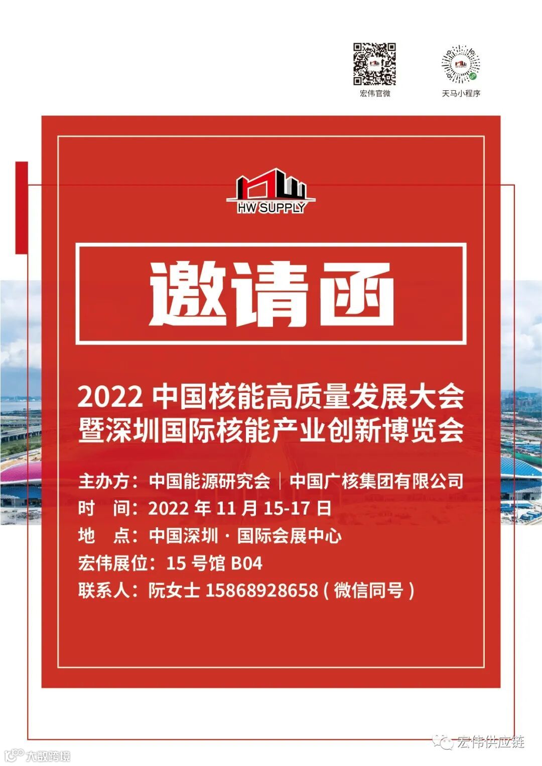 2022年中国核能高质量发展大会暨深圳国际核能产业创新博览会将于2022年11月15-17日在深圳国际会展中心隆重启幕。宏伟供应链在15号馆B04等着您的到来!