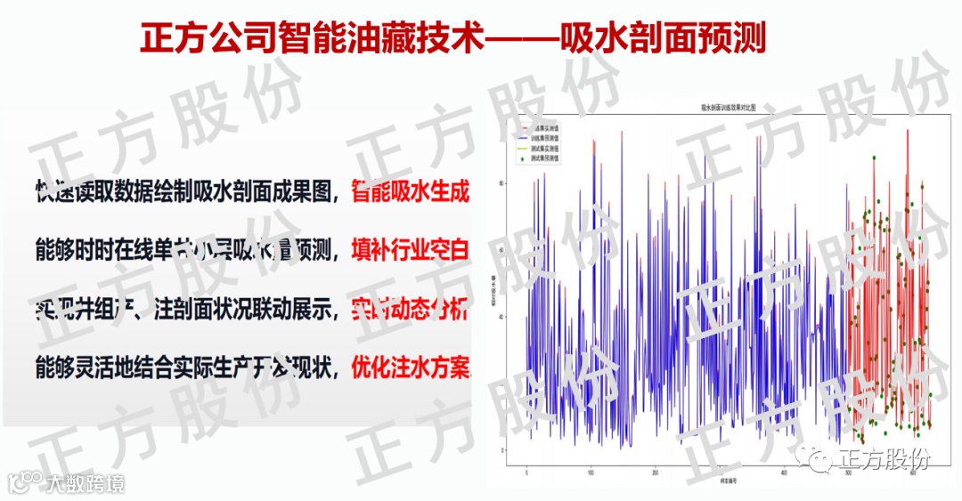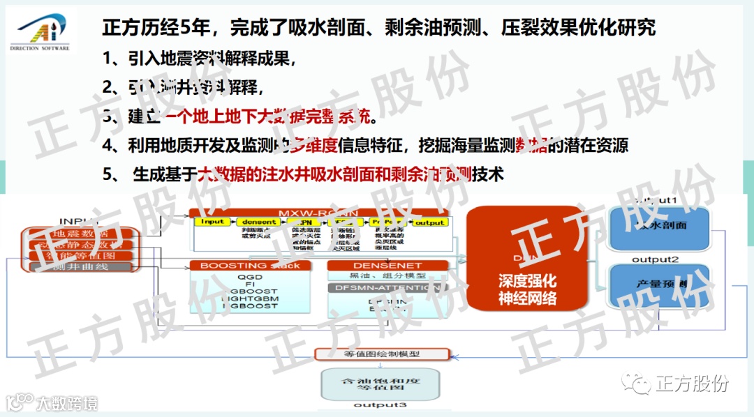 经过多年不懈的努力,在韩大匡院士的带领下,正方自主研发了吸水剖面和剩余油预测技术,作为韩院士的国家级课题《大数据深度学习方法预测各分层剩余油饱和度模型研究及软件研制》通过验收。该技术是基于“井震结合、动静结合、油藏工程理论与大数据人工智能技术结合”,应用于大港油田87口注水井验证,吸水剖面预测符合率85.2%。该技术理论、模型算法以及符合率成果得到了中科院专家组的肯定。