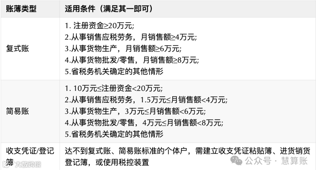 对照标准(见图),确认自己需建立哪种账簿,若未按要求记账,尽快补建并规范。