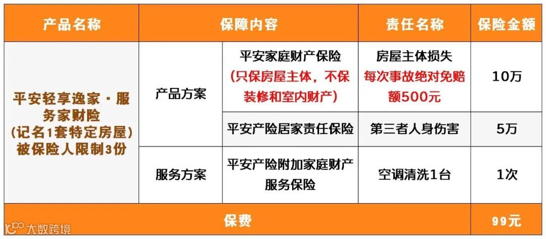 在保单生效期内,还包含了空调挂机清洗服务(仅限一台)。市面上一般的空调清洗服务动辄几百块钱,而平安轻享逸家·家庭财产险每年仅需99元起,还附加了房屋主体损失、居家责任等基础保险,十分划算。