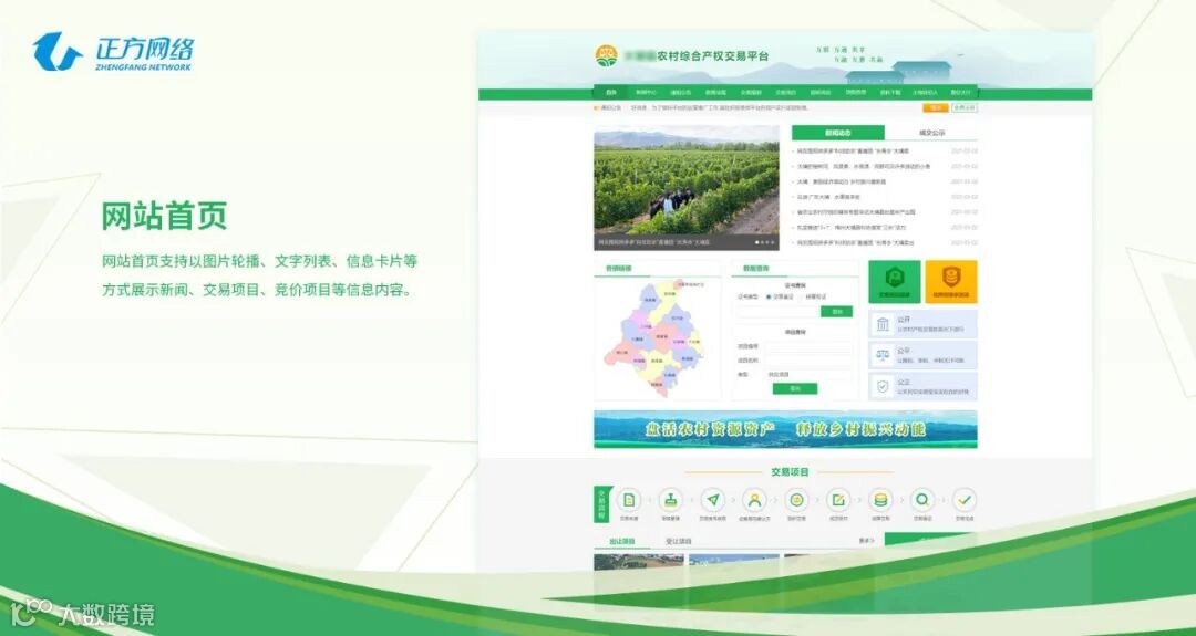 1、网站首页:支持以图片轮播、文字列表、信息卡片等方式展示新闻、交易项目、竞价项目等信息内容。