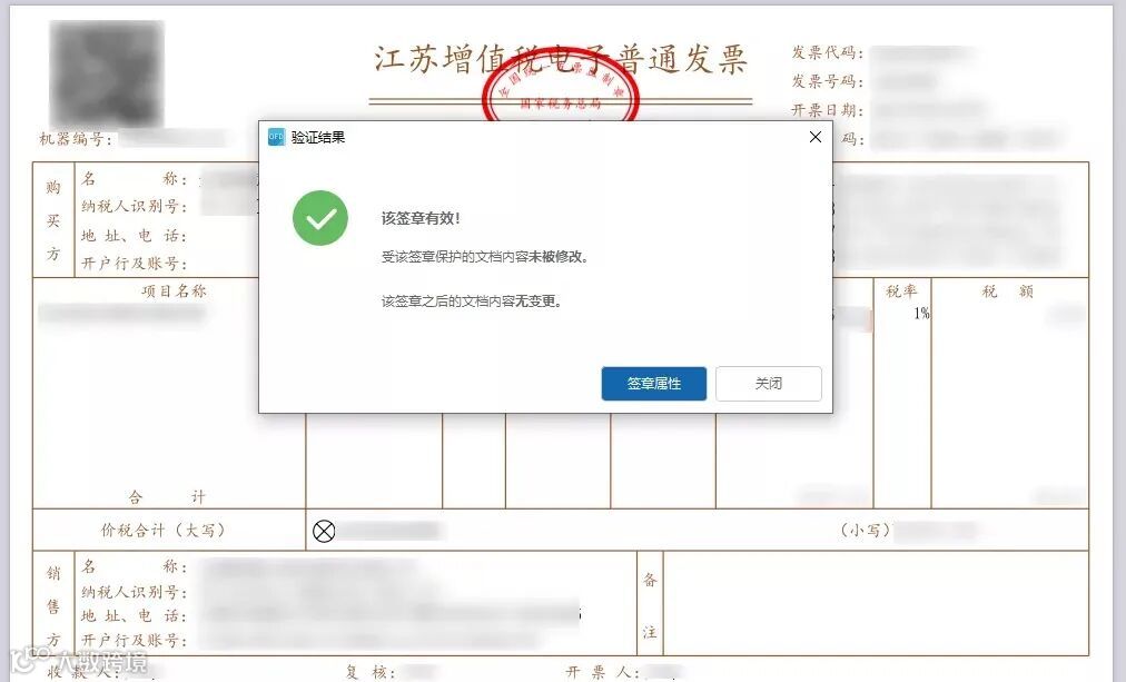 如验证结果为“该签章有效!受该签章保护的文档内容未被修改。该签章之后的文档内容无变更”,表明销售方的电子签名有效。