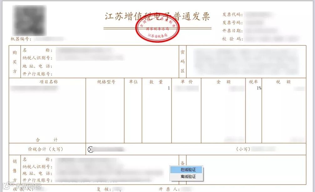 验证电子发票监制章具体方法如下:通过增值税电子发票版式文件阅读器打开已下载的电子专票版式文件,鼠标右键点击发票上方椭圆形的发票监制章,选择“验证”,即可显示验证结果。