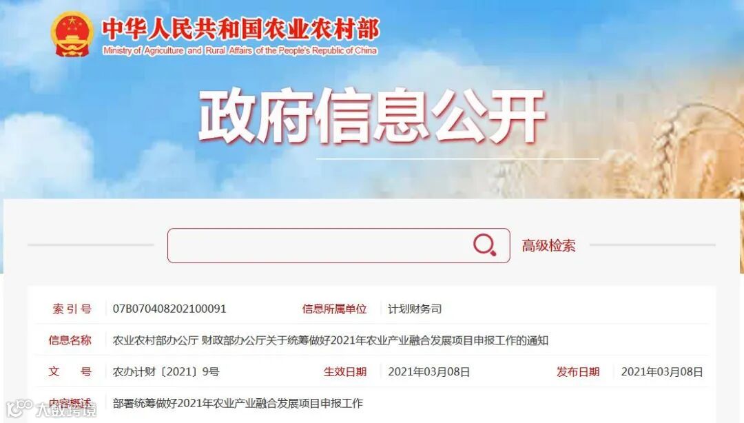 农业农村部办公厅、财政部办公厅印发2021年农业产业融合发展项目相关文件,明确2021年中央财政支持新创建50个国家现代农业产业园。