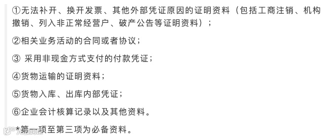 ①无法补开、换开发票、其他外部凭证原因的证明资料(包括工商注销、机构撤销、列入非正常经营户、破产公告等证明资料);