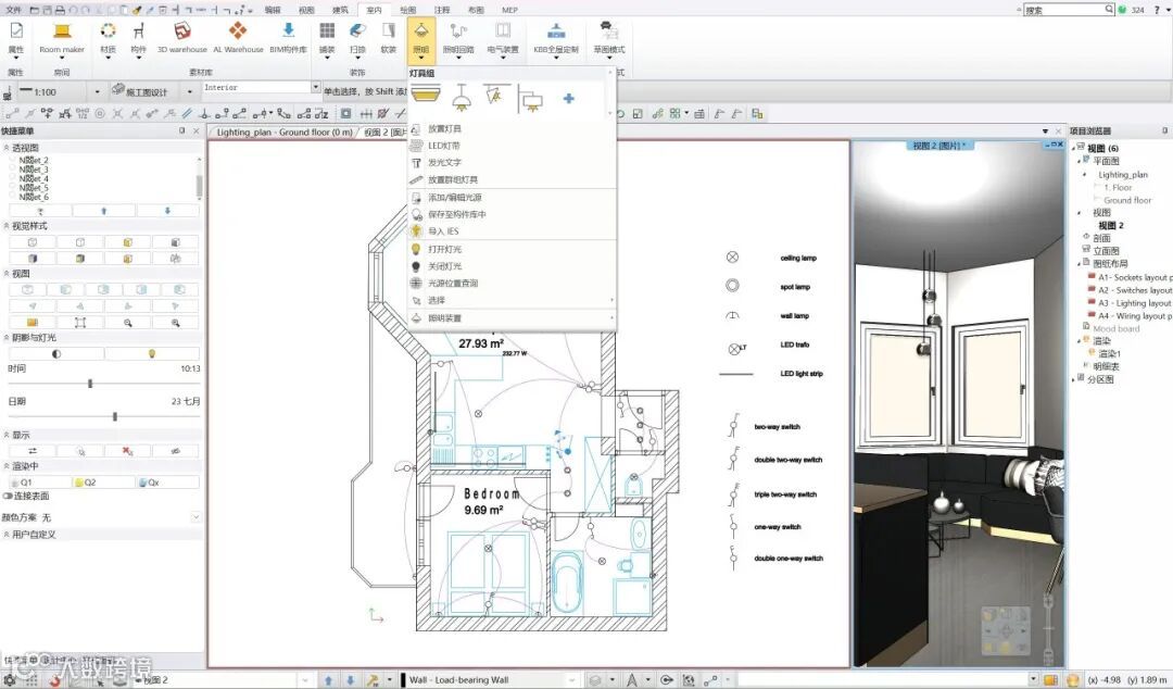 6、专业化室内设计套件提供铺贴、软装,照明等专项设计工具,支持多样化样式组合与细节调控,设计成果输出照片级图像渲染与实景效果。