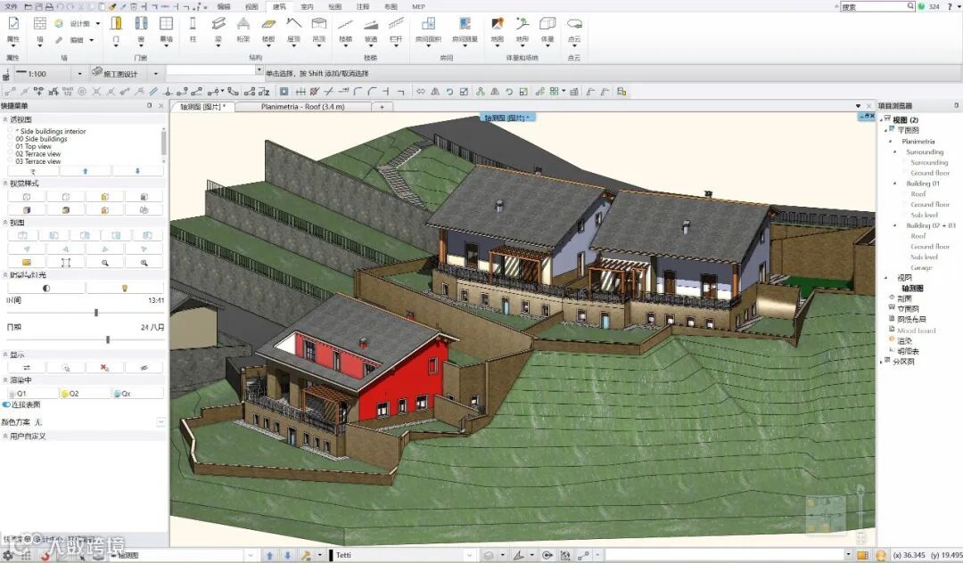 体量与场地设计:支持导入高程点、等高线等多源数据生成三维地形模型,提供高效的地形处理工具,实现场地模型精准构建;支持快速构建体量模型,便于方案推敲。