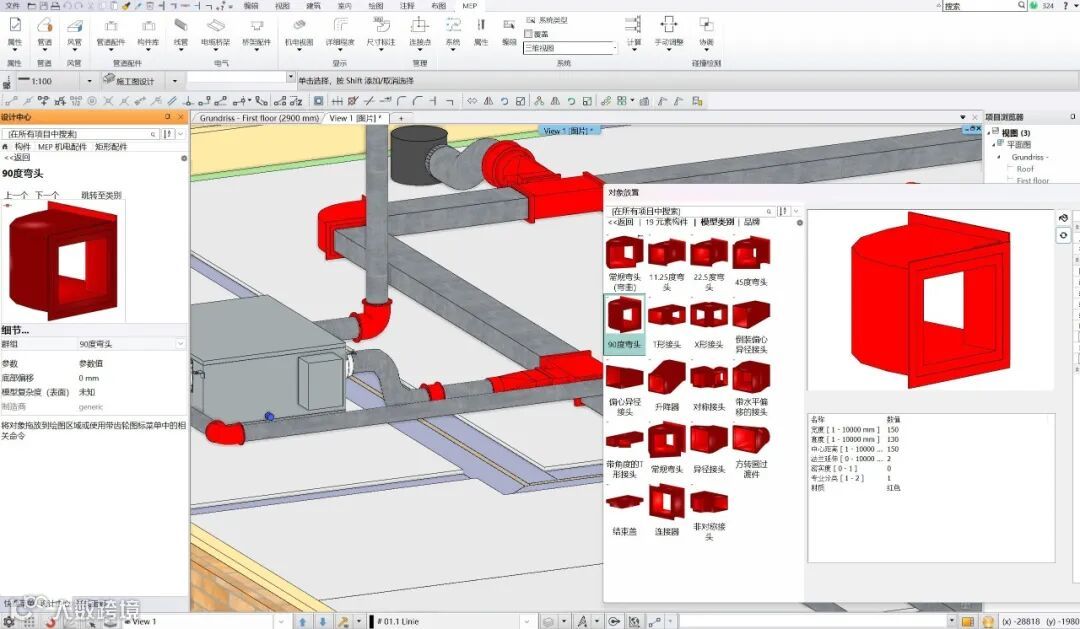 MEP管线设计:内置机电管线设计系统,支持暖通空调、电气布线与给排水工程设计;自动计算最优路由生成管道,自动添加所需管件,复杂布线瞬间完成。