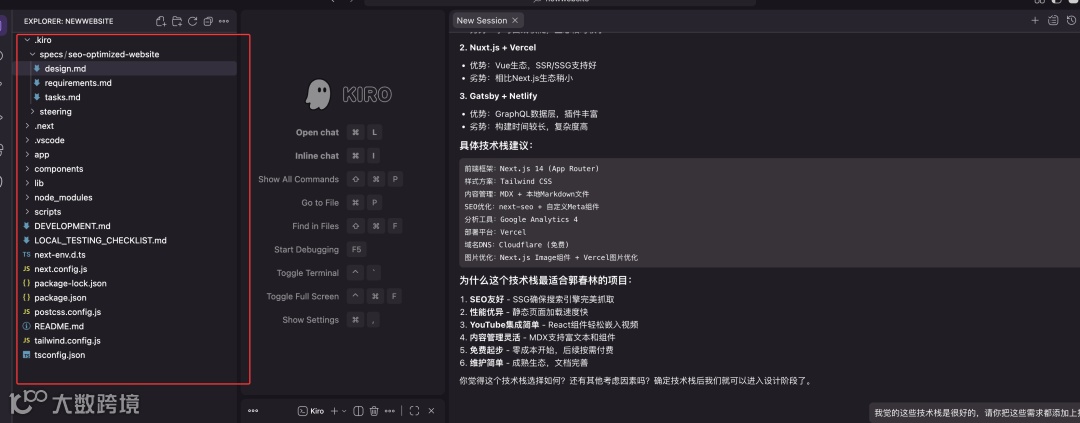 AI直接生成了包含SEO策略、技术栈选择(Next.js + Vercel)和功能清单的完整文档。