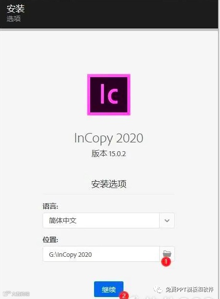 ②点击【继续】进行安装 InCopy 2020 。
