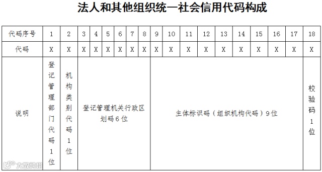 A:法人和其他组织统一社会信用代码,是每一个法人和其他组织在全国范围内唯一的、终身不变的法定身份识别码。每个统一社会信用代码共18位,由五部分构成,其中:登记管理部门代码1位,机构类别代码1位,登记管理机关行政区划码6位,主体标识码(组织机构代码)9位,校验码1位。