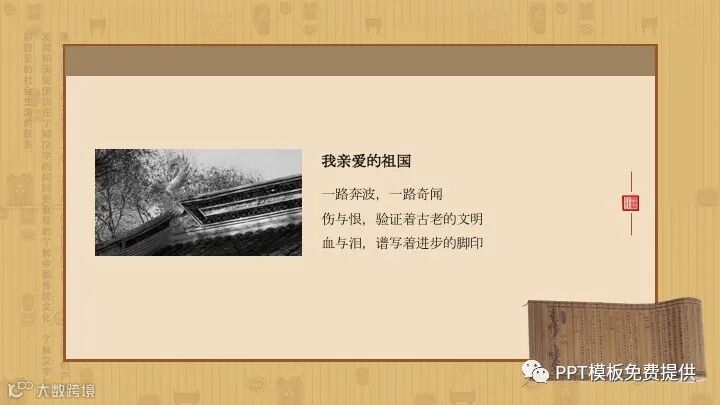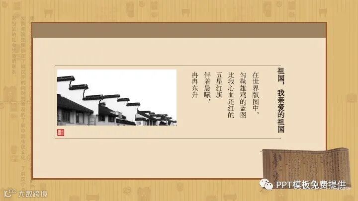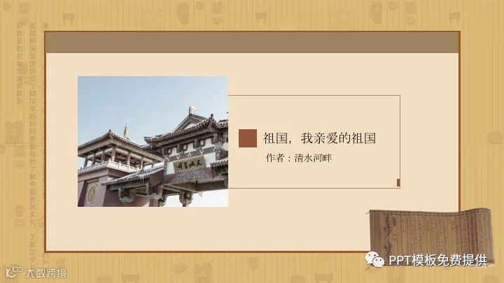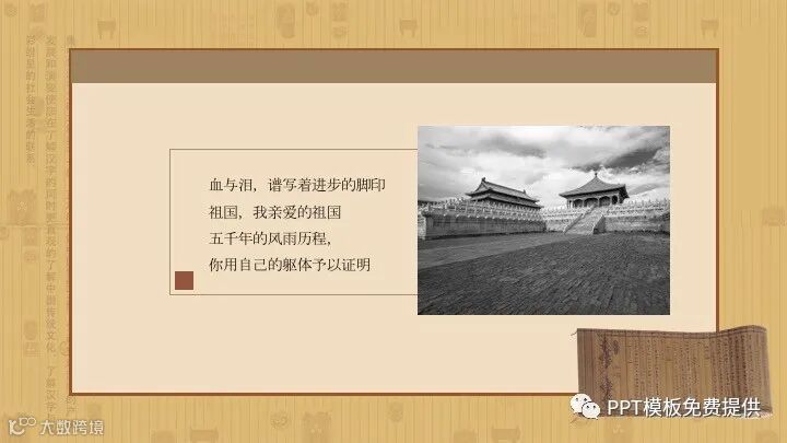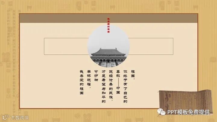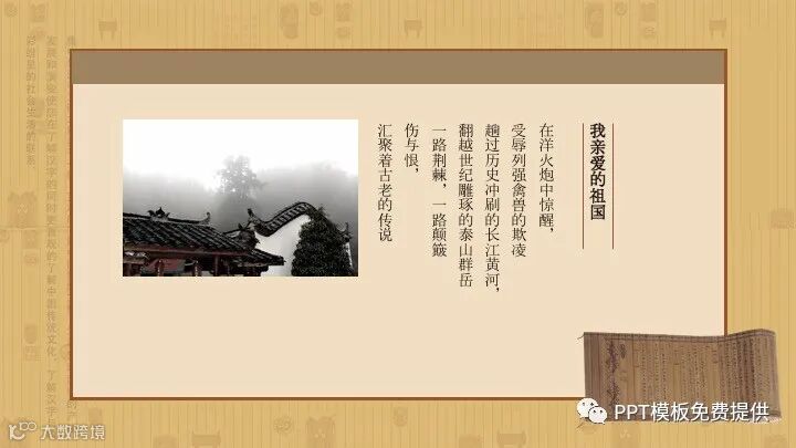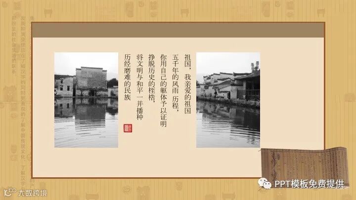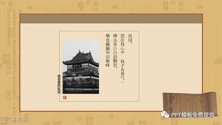 PowerPoint模板内容页,由多张中国古建筑PPT插图,搭配诗歌朗诵文字排版