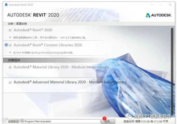 ①点击【浏览】,可以更改软件的安装目录位置。默认安装位置:C:\Program Files\Autodesk\Revit Content 2020