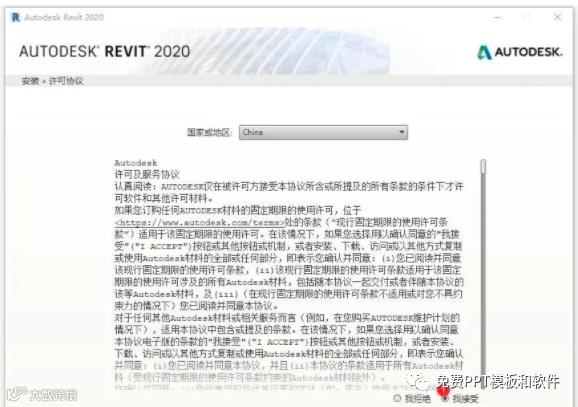 4、进入 Revit 2020 许可协议界面,①勾选【我接受】②再点击【下一步】。