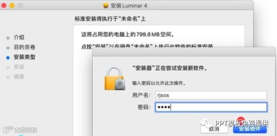 4、Luminar 4 安装准备就绪,①点击【安装】,②输入开机密码,点击【安装软件】 。