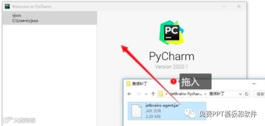 3、把激活补丁【jetbrains-agent-latest】拖入【Pycharm】界面中,显示激活补丁安装。