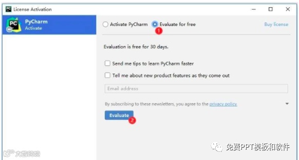 1、Pycharm 自动运行,进入激活界面,①选择【Evaluate for free】,②点击【Evaluate】 进入试用界面,先放一旁。