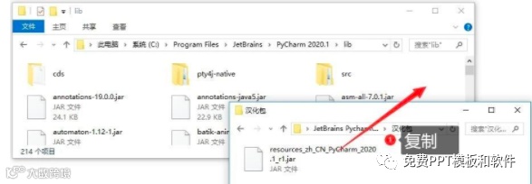 5、把汉化补丁【resources_zh_CN_Pycharm_2020_r1.jar】复制到【lib】文件夹中,重启软件即可汉化。