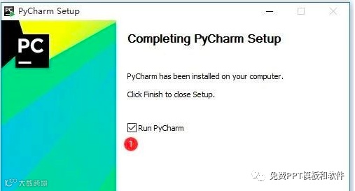 6、安装完成,①勾选【Run Pycharm】自动运行,②点击【Finsh】。下面进行激活和汉化详解。