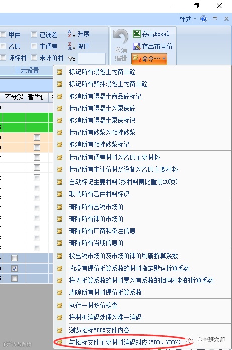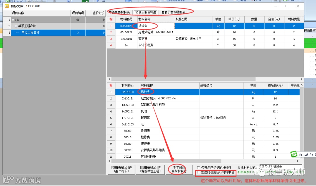 4,材机汇总窗口:与招标主要材料对应(切记一定是手工一条一条对应,对应后再点按单位工程编码自动对应)