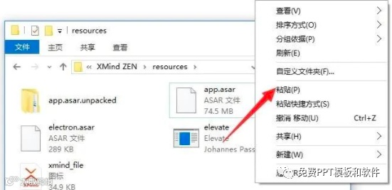 5、进入resources文件夹后,把刚刚复制的【app.asar】激活补丁【粘贴】到resources文件夹里。