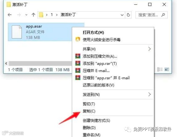 2、进入激活补丁文件夹,右击【app.asar】补丁选择【复制】。