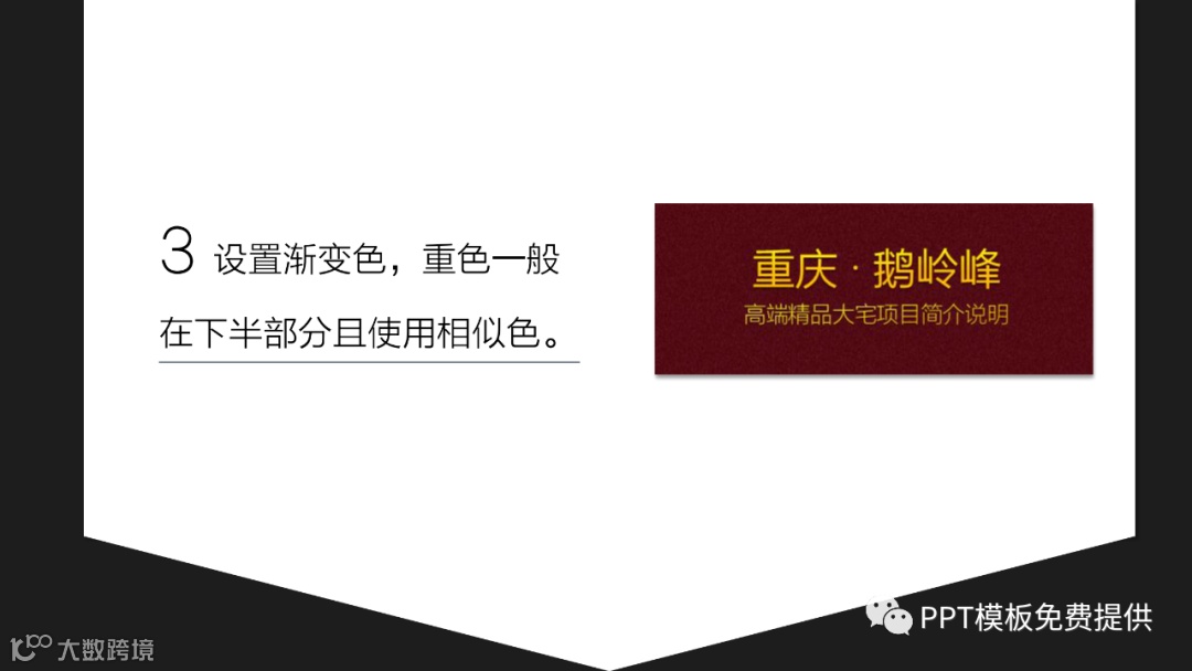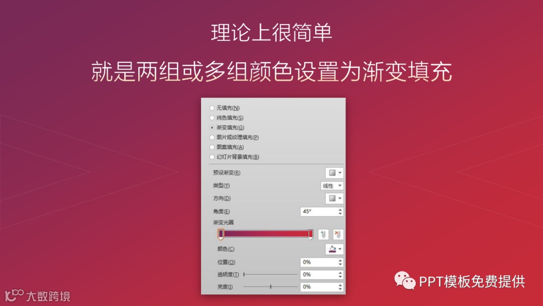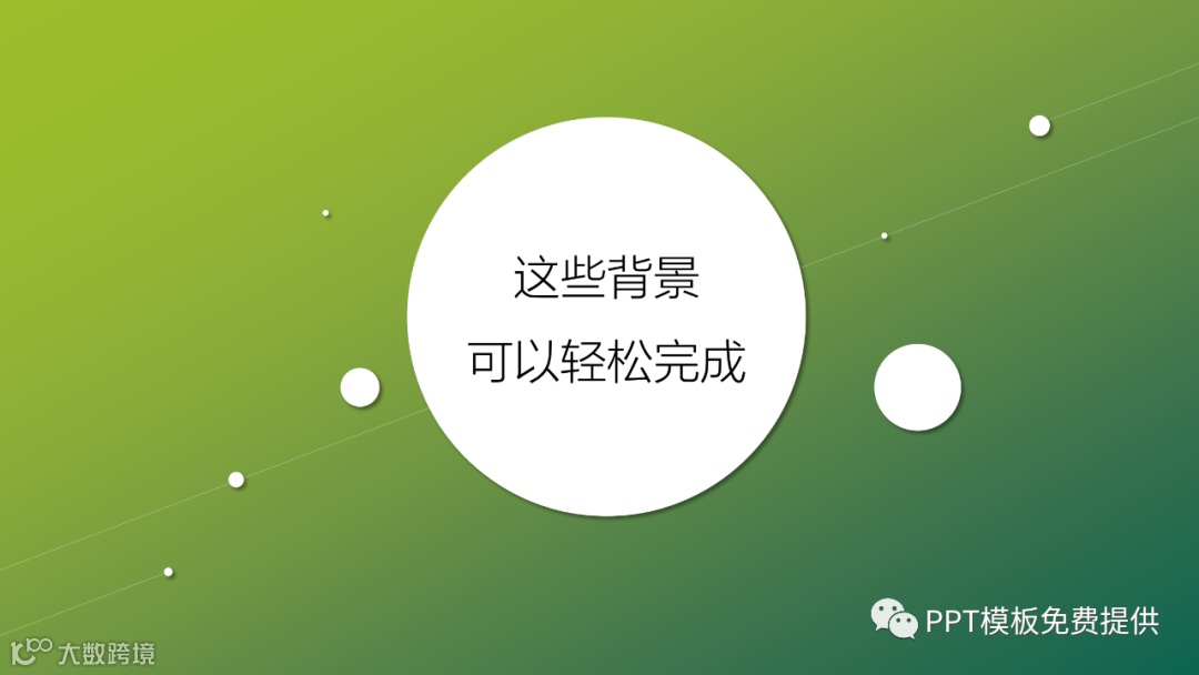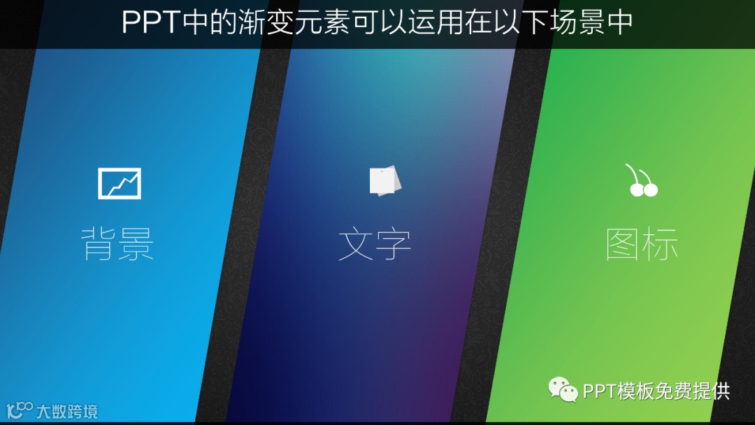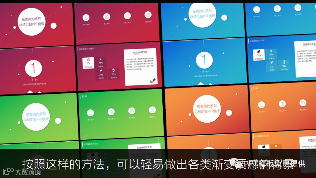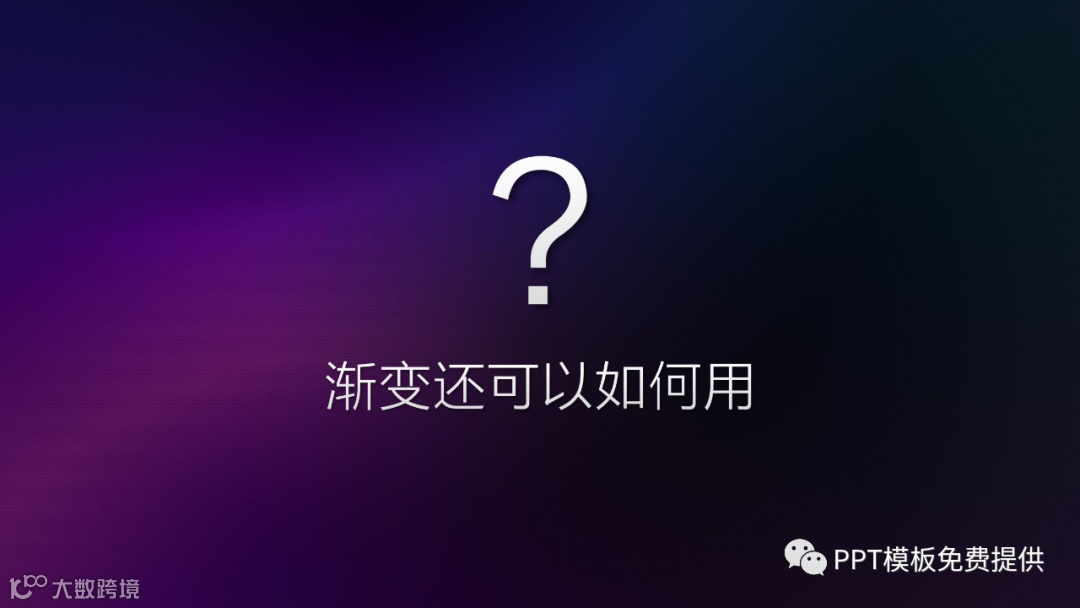 今天我们聊聊PPT中渐变的逼格“渐变的运用”,PPT中的渐变匀速可以运用在以下场景中:背景、文字、图标。渐变在背景中的运用比比皆是,比如下面这些渐变的背景。这些背景图或渐变元素在哪找的?实际上就是在PPT中制作的。理论上很简单,就是两组或多组颜色设置为渐变填充