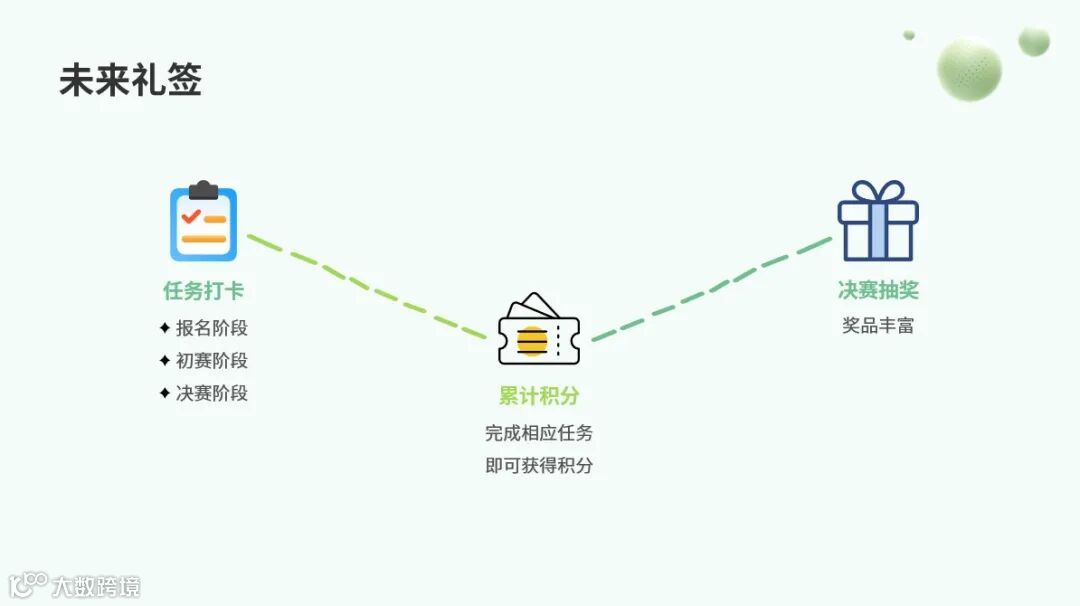 1、所有参赛选手均可参与“未来礼签”活动,选手可通过完成任务累计积分,积分可用于现场抽奖。
