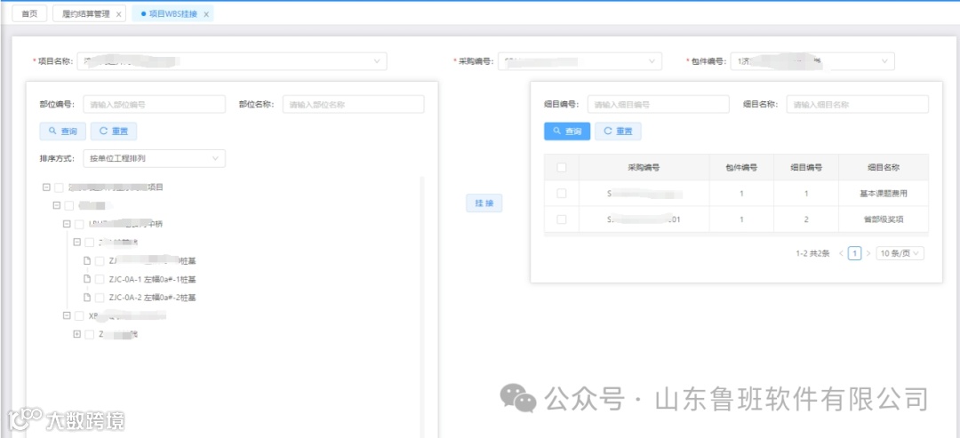 通过WBS拆解、挂接,将部位与采购清单关联,维护完工状态,生成结算台账
