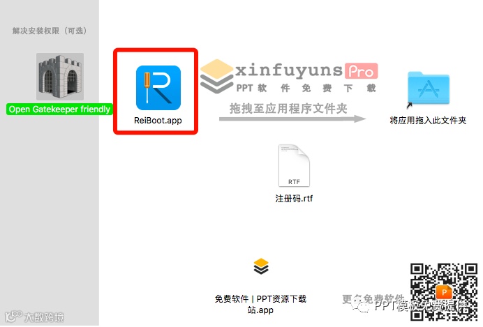 2、如图:打开ReiBoot Pro for Mac v7.2.9后,把【ReiBoot】拖入【将应用拖入此文件夹】即可完成安装!