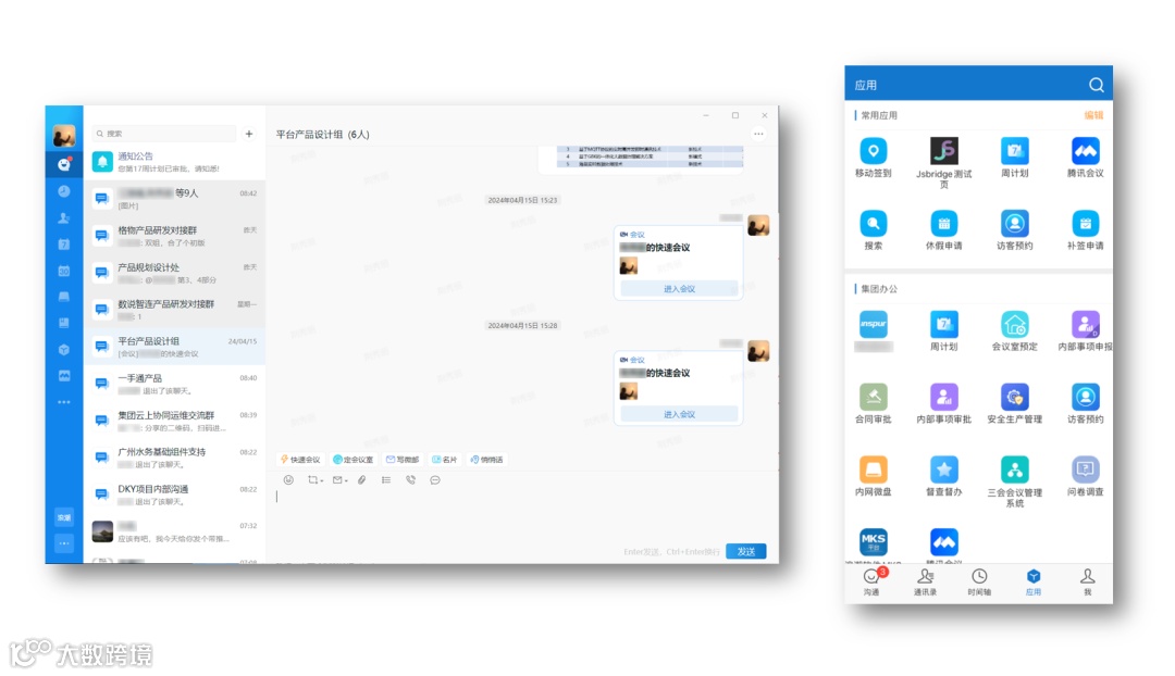 集成开放:提供应用集成标准,实现应用全生命周期管理;支持与线上会议、在线文档等服务深度集成,无需下载其他APP;提供丰富的前后台服务API,支持行业应用快速调用平台能力。