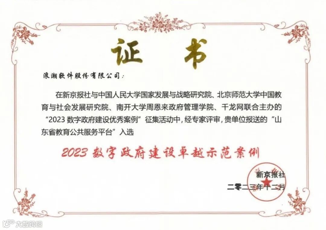 12月9日,由新京报社牵头主办的“2023数字政府建设优秀案例”答辩及发布活动在北京举行。会上,在与来自广东、江苏、浙江等地的44家单位共同参加现场答辩后,浪潮软件“山东省教育公共服务平台”案例成功入选新京报社“2023数字政府建设卓越示范案例”。