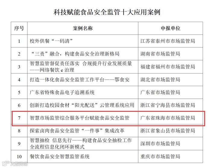其中,智慧市场监管综合服务平台赋能食品安全监管案例入选“科技赋能食品安全监管十大应用案例”,食品安全“两个责任”工作系统案例入选“科技赋能食品安全监管十大创新案例”。