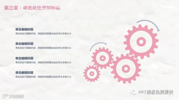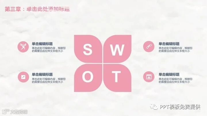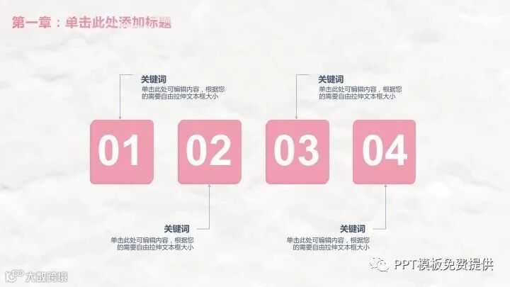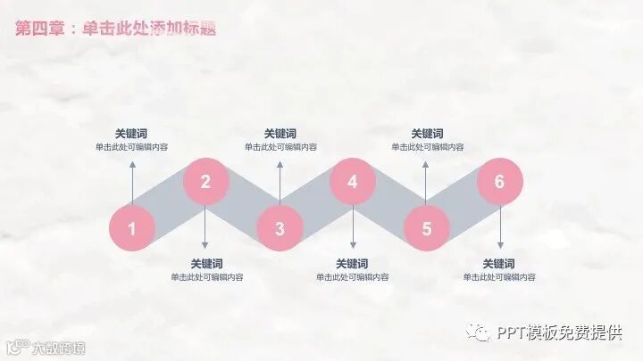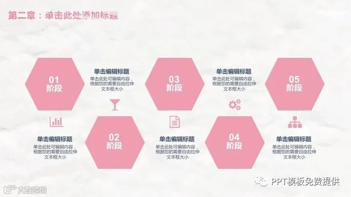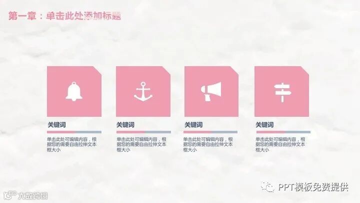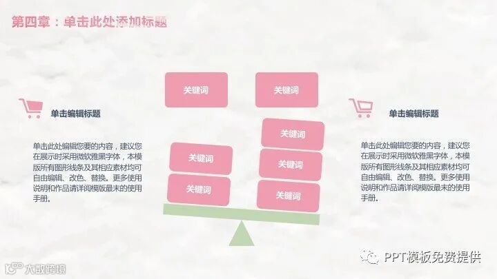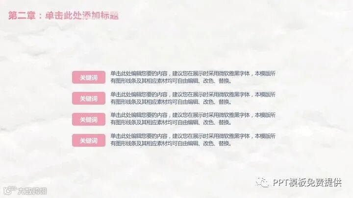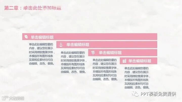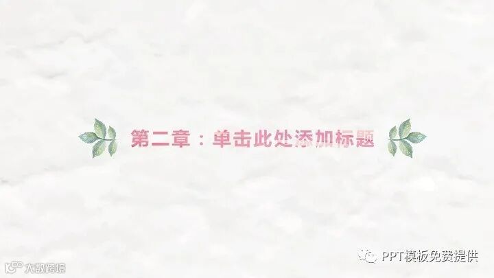 PowerPoint模板内容页,由25张粉色扁平化幻灯片图表制作。另外使用了水彩绘制的树叶图案装饰。