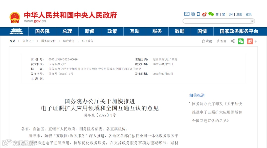 近日,国务院办公厅发布《关于加快推进电子证照扩大应用领域和全国互通互认的意见》,提出要扩大电子证照应用领域,推动电子证照全国互通互认,全面提升电子证照应用支撑能力。