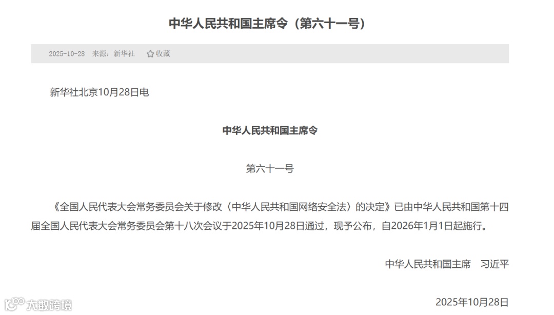 2025年10月28日,第十四届全国人大常委会第十八次会议表决通过了《全国人民代表大会常务委员会关于修改〈中华人民共和国网络安全法〉的决定》(以下简称“《网安法修改决定》”),并将于2026年1月1日正式施行。这也是《网络安全法》自2017年6月实施以来的首次系统修订。