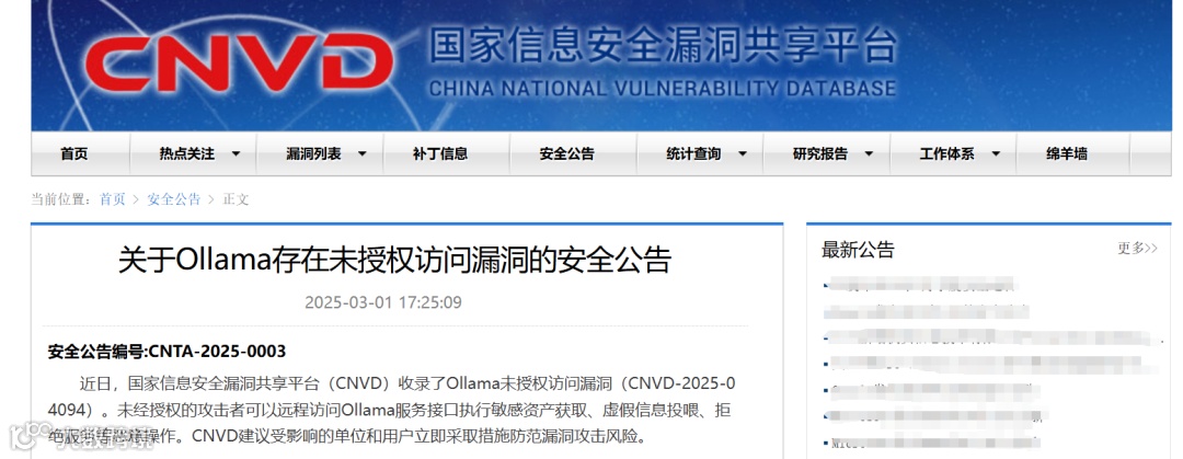 近日,国家信息安全漏洞共享平台(CNVD)发布高危预警,Ollama未授权访问漏洞(CNVD-2025-04094)被正式收录。未经授权的攻击者可远程访问Ollama服务接口,发起恶意攻击。