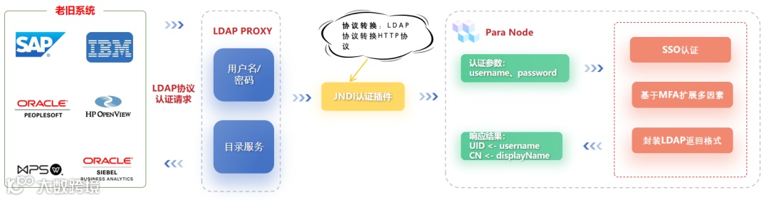基于派拉软件SSO定制化JNDI插件,接收第三方系统的LDAP认证请求,并在插件内提取出用户的身份信息(通常为用户名和密码),将其转化为NODE网关认证服务的 HTTP 请求格式。