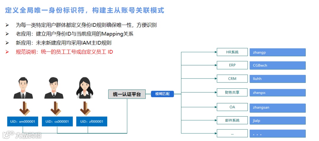 借助IAM平台,将不同系统中的身份数据映射到主账号(OneID),形成主-从关系。用户访问任一业务应用系统时,通过主从账号映射表即可快速自动化检查不同系统中的身份标识,确保准确识别同一用户。