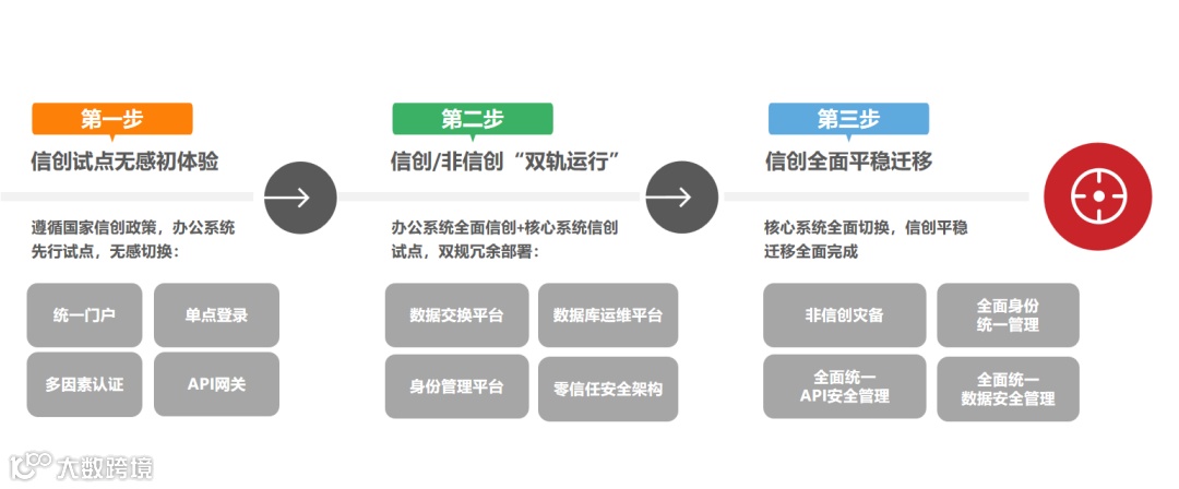 此外,建立统一的数据交换平台(ESB)将应用解耦,完成应用数据交换,实现过渡期两套环境并存。与此同时,借信创改造契机,融入更多安全防护能力,强化身份安全、API应用安全、数据安全等安全能力,帮助企业真正实现平滑无感安全迁移。